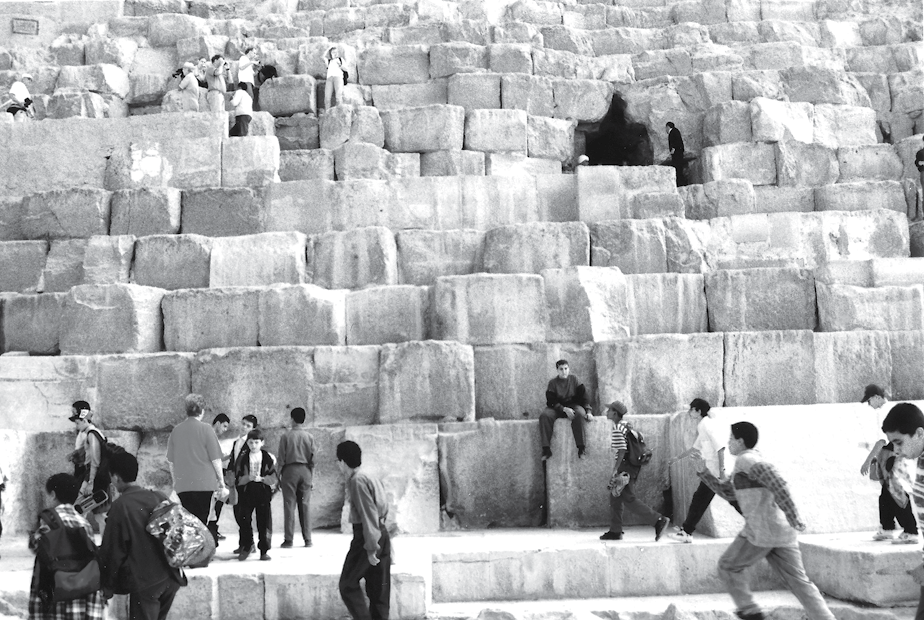 Мы вышли из автобуса в тени пирамиды Хеопса. – Давай, посидим и посмотрим не нее, – предложил Олег. Сели на камень, а взгляд побежал вверх по камням, как по ступеням, все выше и выше и остановился у самого неба. Замечательно! Наконец встали и подошли к основанию. Померились ростом у одного из камней. Потрогали гладкую