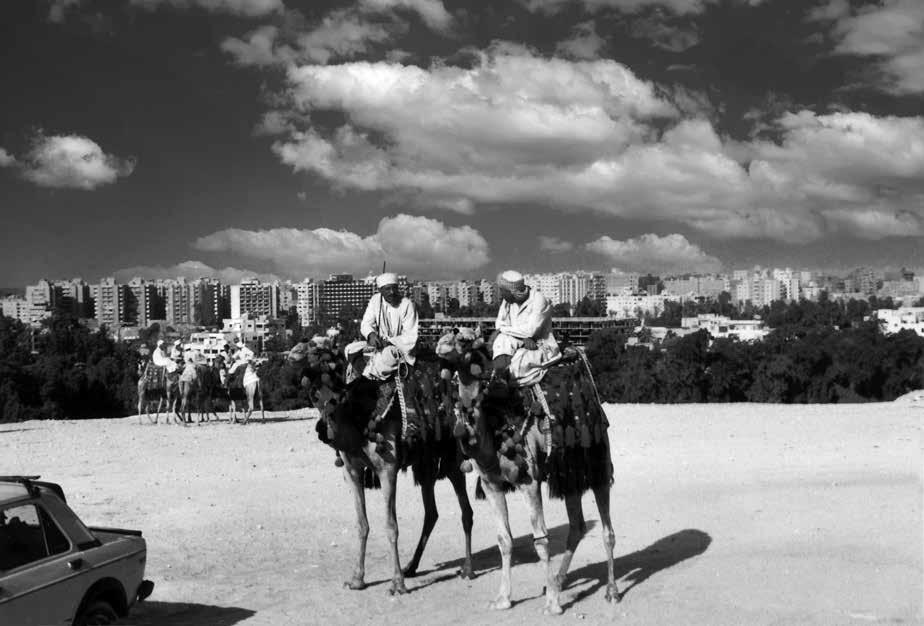 Автобус остановился на краю плоскогорья. По самому краю на высоких верблюдах гарцевали два всадника. Их широкие одежды, покрывала на голове и верблюды — одного цвета с пустыней. Только пестрые ковры на спинах верблюдов придавали этой картине краски. За ними тянулась широкая долина, и, насколько хватает глаз, распростерся Каир. Его прямоугольные бетонные здания такого же цвета, как пустынное плоскогорье, на котором мы находились. Разделяло эти два пространства – пустыни и города – широкая полоса кудрявых темно-зеленых деревьев.