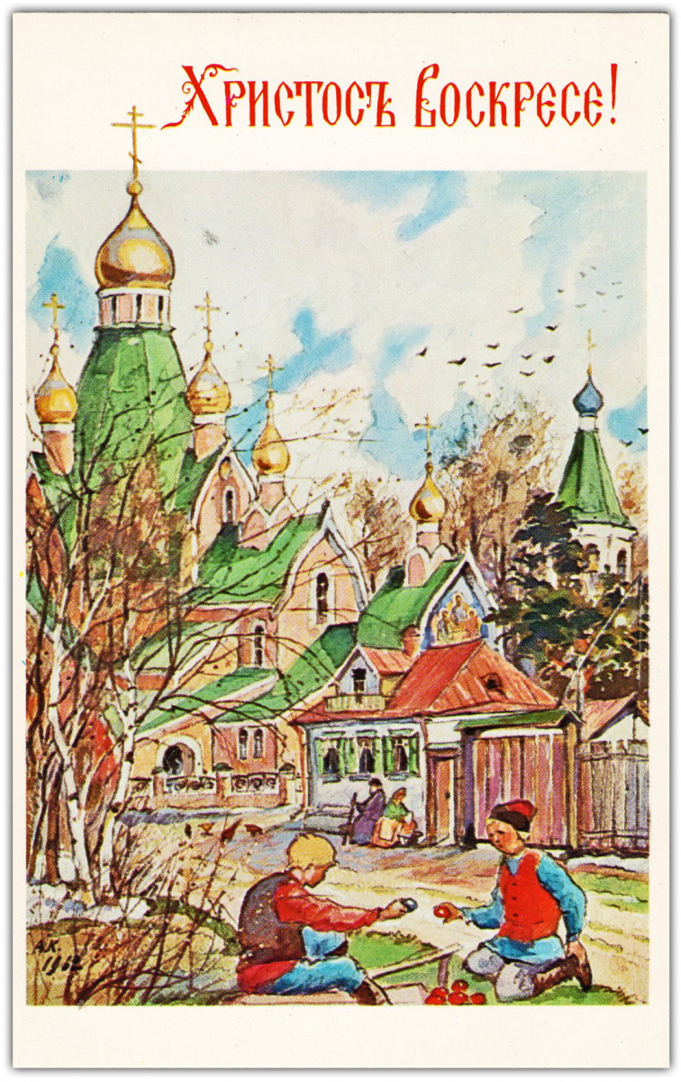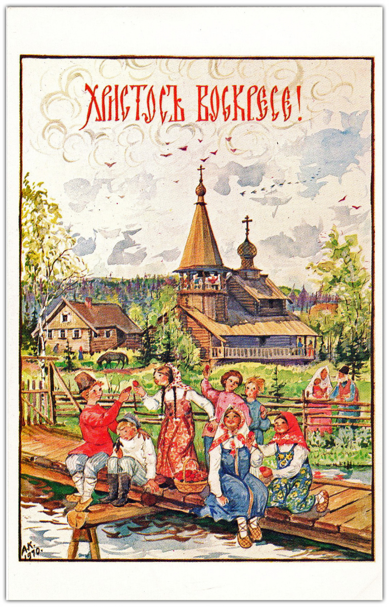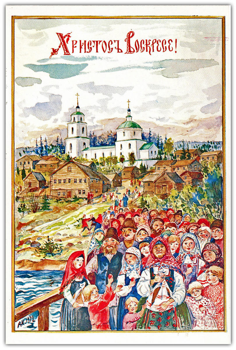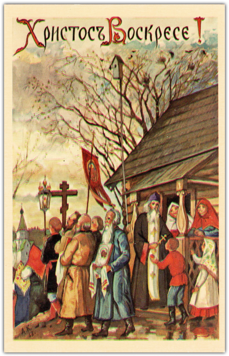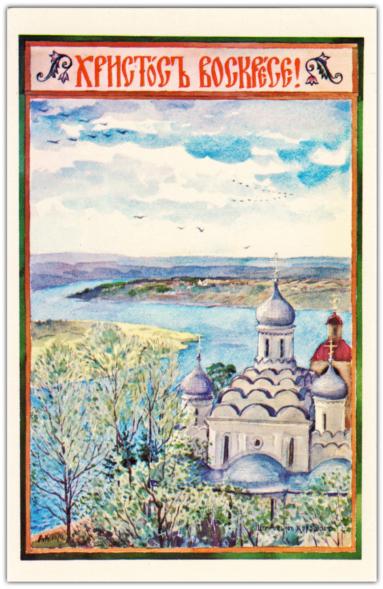 Свои первые шесть поздравительных открыток – четыре Пасхальных и две Рождественских – о. Киприан издал в 1954 году. Все они без подписи, но по стилю работы сомнений в их авторстве не возникает. Эти шесть открыток – единственные с закругленными углами. В те годы в Америке такой формат имел определенную популярность среди издателей открыток. Согласно информации, опубликованной Р.В. Полчаниновым, тираж каждой открытки составлял 3000 экземпляров.