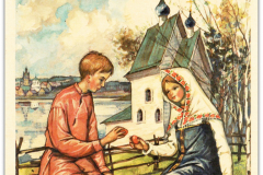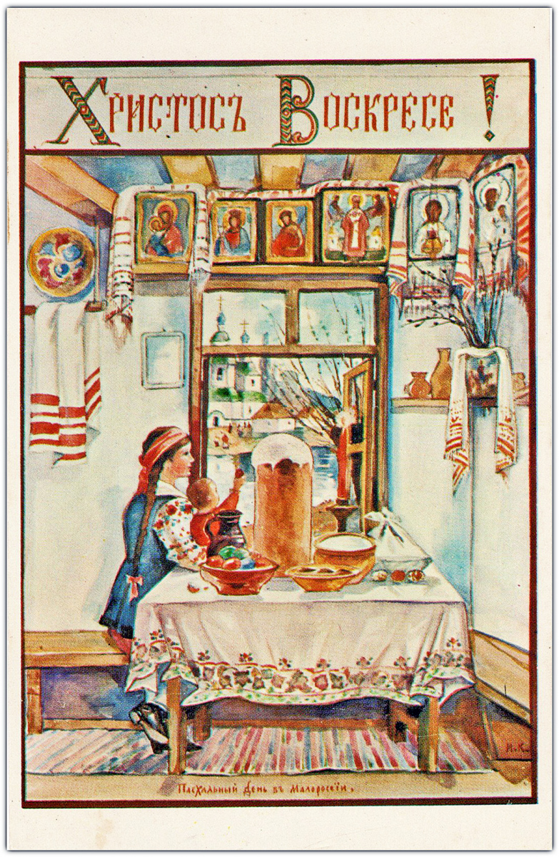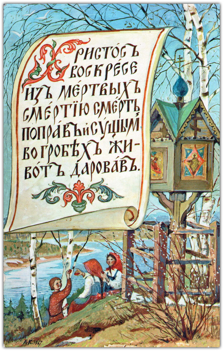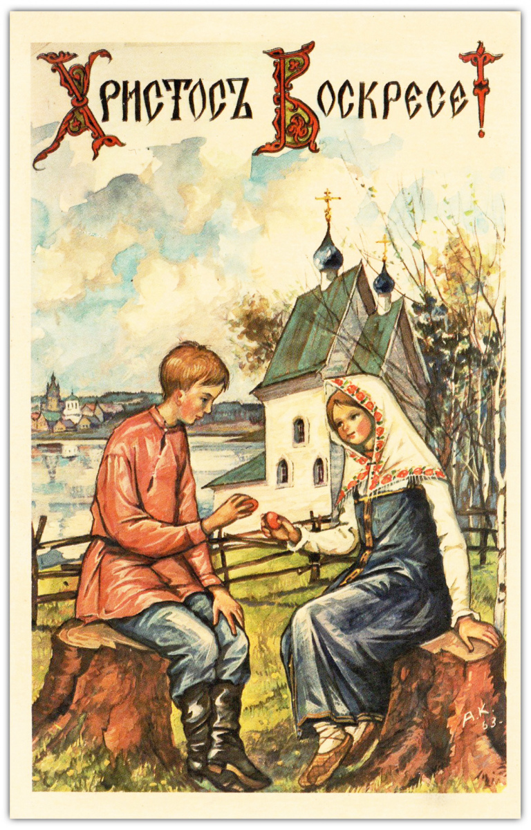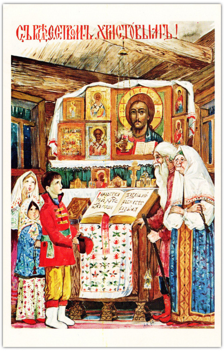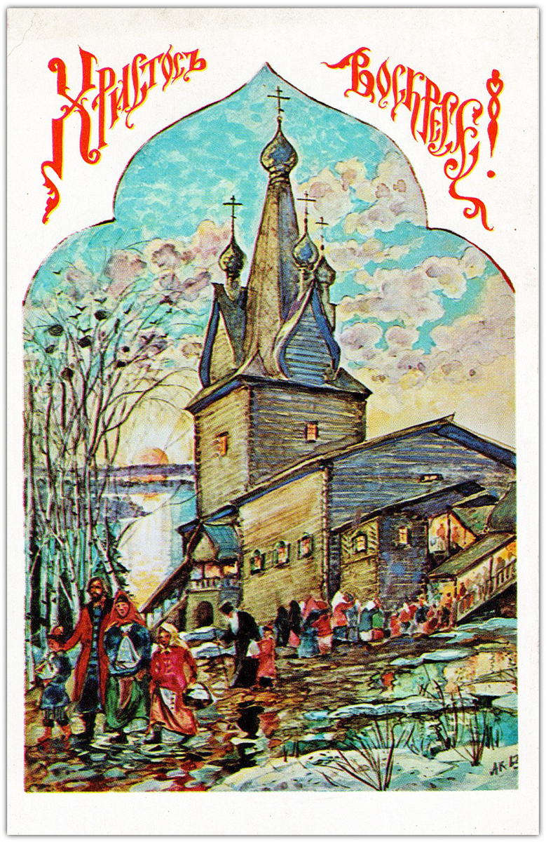 Свои первые шесть поздравительных открыток – четыре Пасхальных и две Рождественских – о. Киприан издал в 1954 году. Все они без подписи, но по стилю работы сомнений в их авторстве не возникает. Эти шесть открыток – единственные с закругленными углами. В те годы в Америке такой формат имел определенную популярность среди издателей открыток. Согласно информации, опубликованной Р.В. Полчаниновым, тираж каждой открытки составлял 3000 экземпляров.