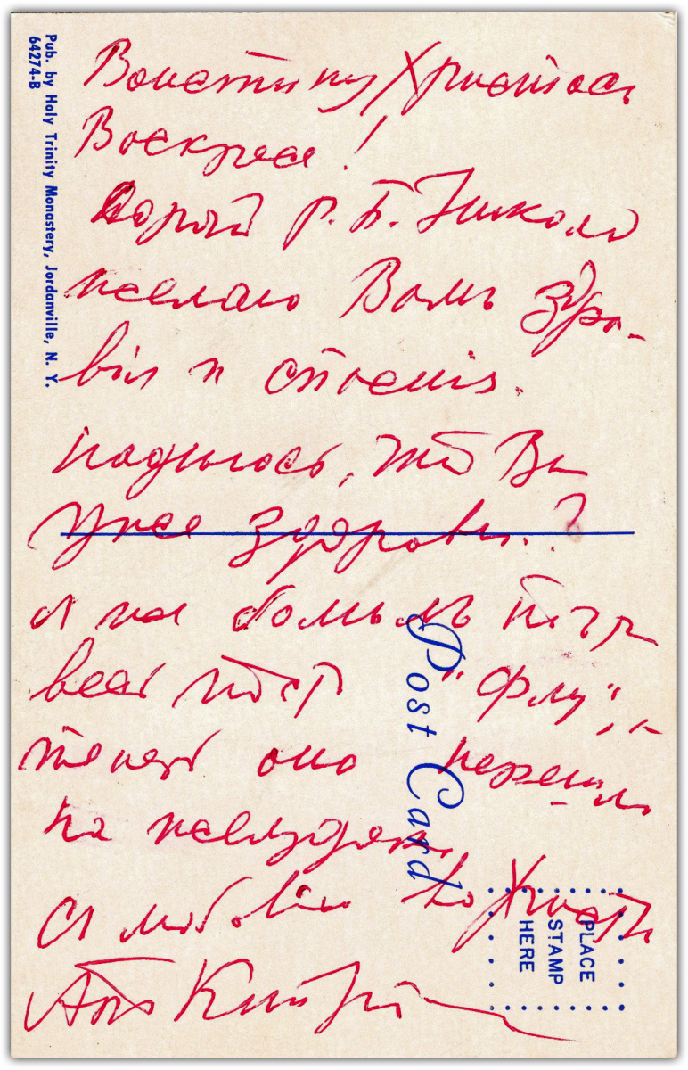 Такие открытки стандартного размера издавались монастырем до 1983 года. Они продавались к праздникам у свечных ящиков во многих американских приходах Русской Православной Церкви Заграницей, а также в других странах. Например, в моей коллекции есть открытки, посланные из Франции и Канады. Интересно, что на одной из них стоит ручная надпечатка, сделанная по-французски: «В пользу Союза Русских Инвалидов». Видимо, они перепродавали эти открытки с небольшой накруткой в цене.