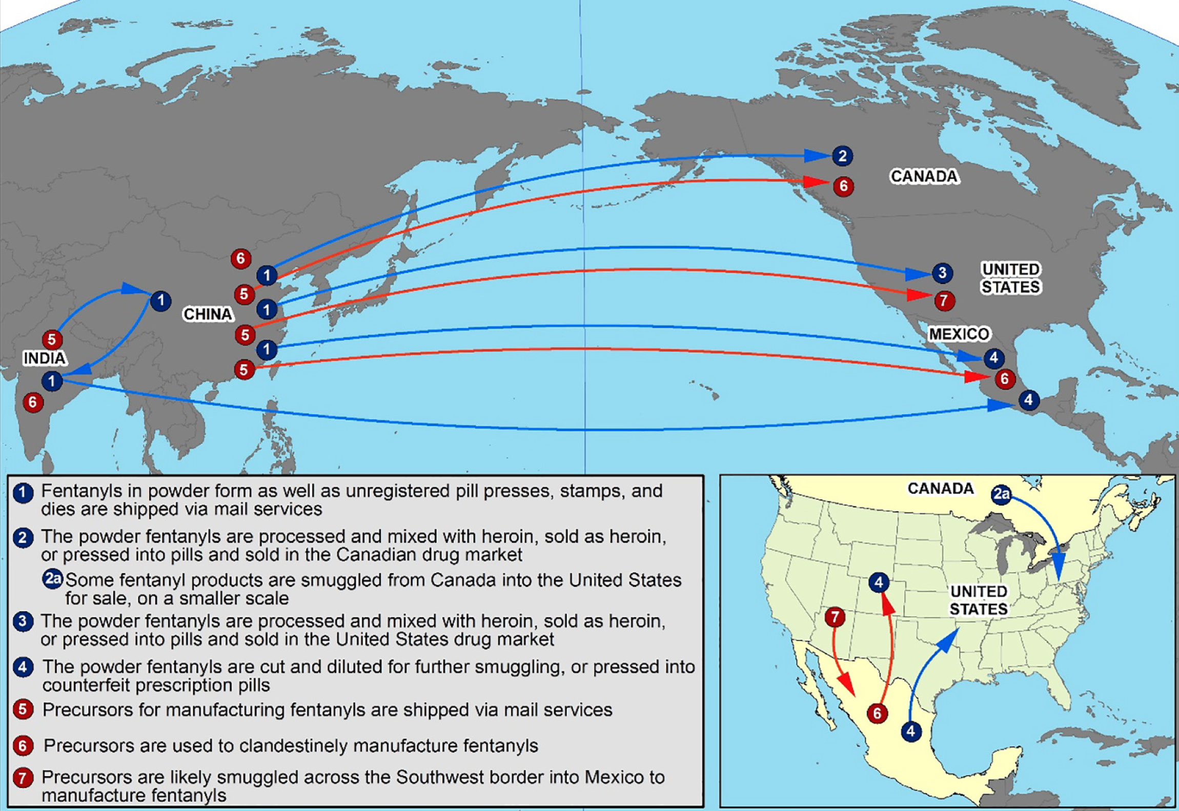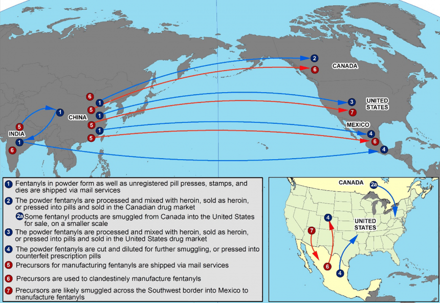 Компоненты для незаконного производства фентанила поступают в США прежде всего из Китая. Они переправляются в Мексику и другие латиноамериканские страны, попадая затем в лаборатории, принадлежащие мексиканским наркокартелям, и в итоге оттуда — в США через крайне слабо охраняемую при администрации Байдена границу. В 2019 году под давлением администрации Трампа правительство Китая добавило фентанил в число контролируемых веществ. Однако, это не остановило переправку компонентов для его изготовления из Китая в Мексику. Помимо чрезвычайной опасности фентанила, а его смертельной дозой (в зависимости от роста и веса человека и других факторов таких, как предыдущий опыт употребления) могут быть всего 2 миллиграмма этого вещества, поистине общенациональной проблемой в США его делает то, что распространение и использование этого наркотика по территории страны мало зависит от социально-экономических характеристик региона и его политических предпочтений.