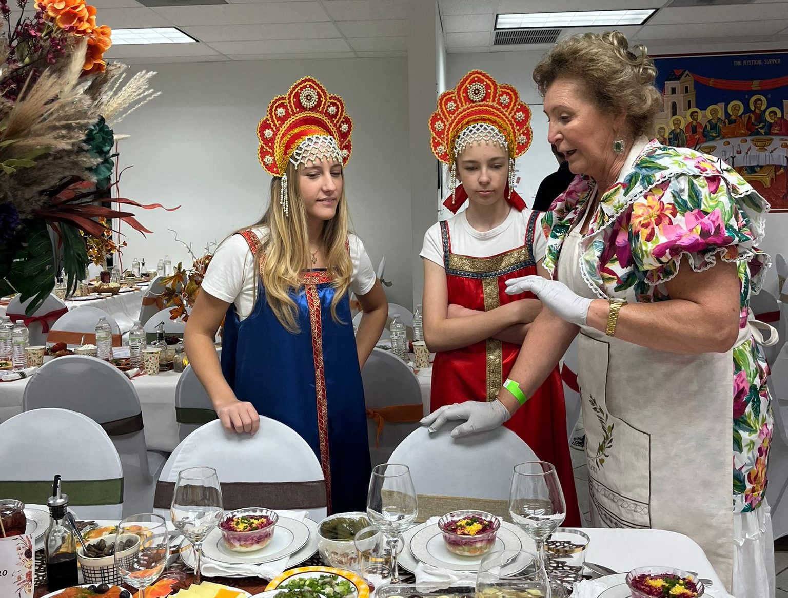 Но это мне так казалось, ведь я была настроена очень лирично. Хотя самим организаторам фестиваля было не до сантиментов. Нужно было принять и накормить около 160 гостей, многие из которых впервые пришли на  подобный праздник и даже никогда не пробовали блюда русской кухни. Вот здесь сестричество церкви во главе с Мариной Дрингус расстаралось вовсю, и, можно сказать, наши сёстры превзошли сами себя. Юные боярышни (прихожанки нашего храма — Маруся и Вера Родзянко, Анфиса и Стефания Солоп, Жозефина Ленз и  Тоня Пономаренко) в русских сарафанах и кокошниках  разносили по столам красиво украшенные аппетитные блюда.