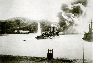 Порт-Артур. Пожар на нефтебазе, вызванный японской стрельбой. Виден российский крейсер «Паллада». 1904 г. Из фотоархива ВМС Японии.