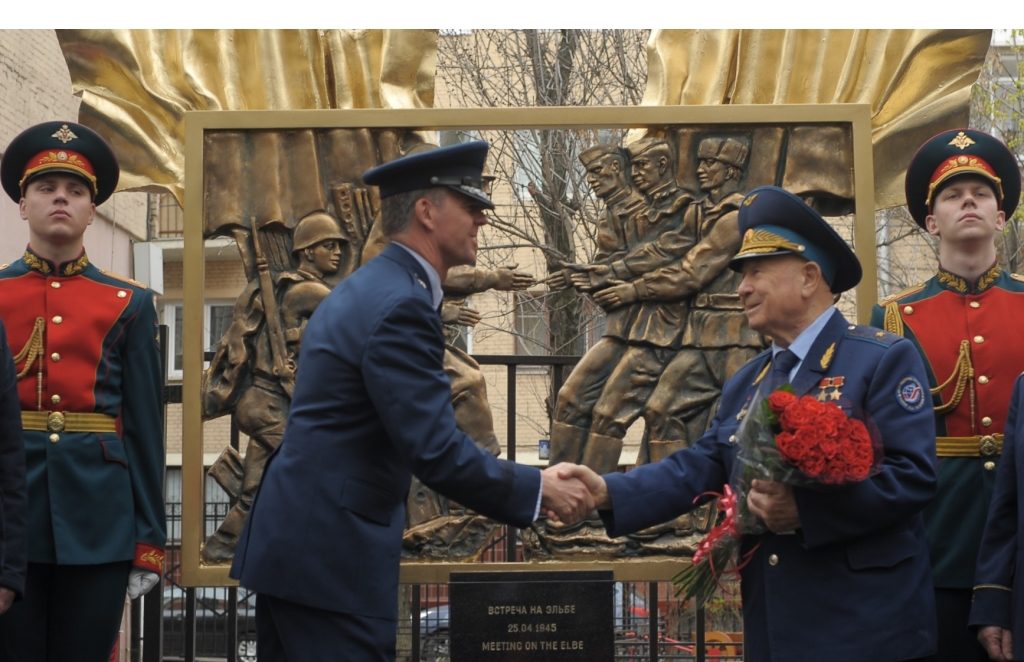 В Америке, России и Германии в разное время были установлены памятные знаки об этой встрече, но 25 апреля в 2015 и 2016 годах в центре Москвы на Арбатском переулке Сивцев Вражек появились еще два. В 2015-м году было высажено Дерево Дружбы народов России и США, а также заказана скульптурная композиция Встречи на Эльбе народному художнику России Александру Бурганову. Кстати, его статуя поэту Александру Пушкину выставлена в Университете Джорджа Вашингтона на пересечении улиц 22 & H.