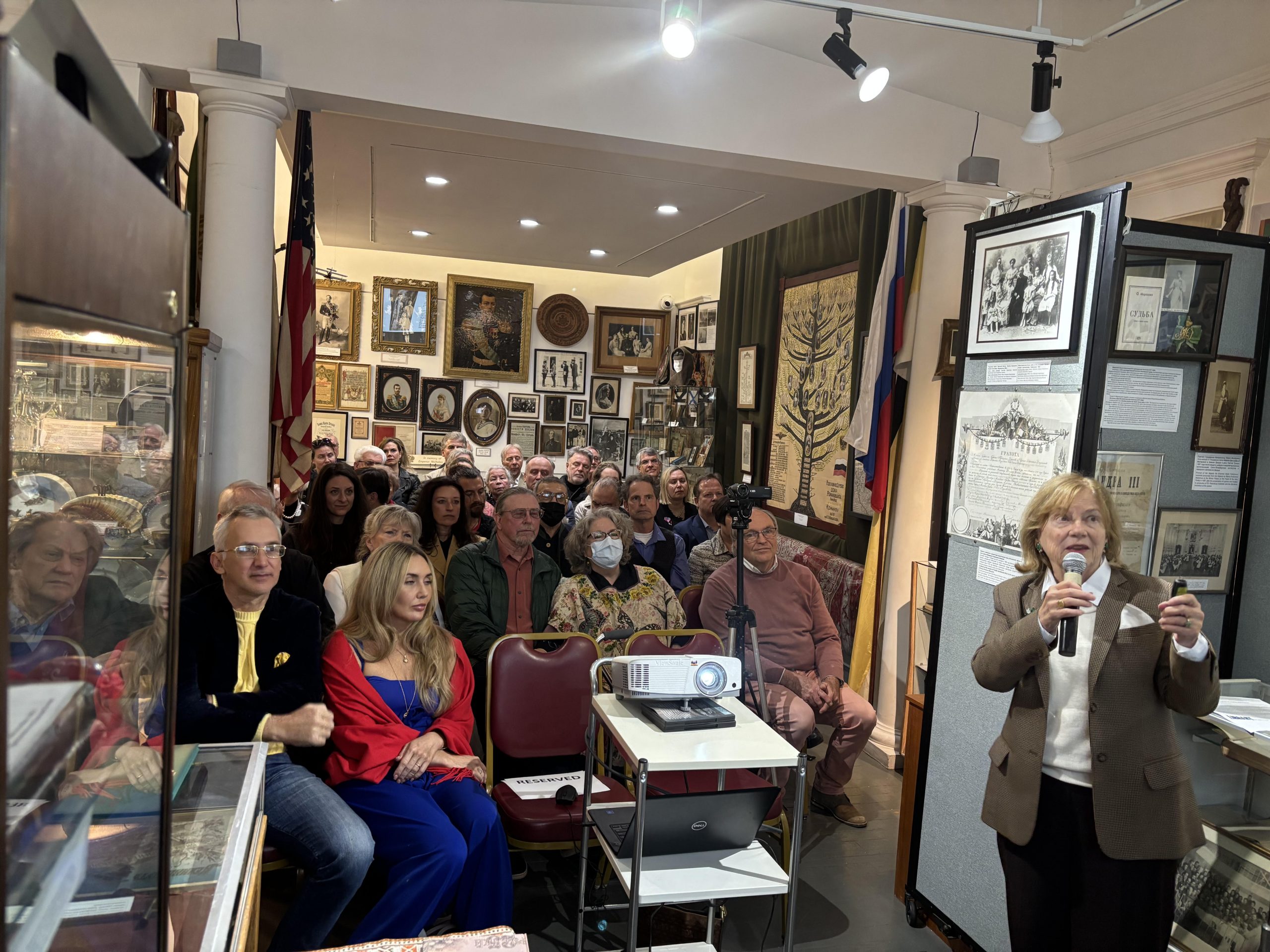НА ВЕРХНЕМ СНИМКЕ: Елена Даниельсон выступает на встрече друзей музея в Сан-Франциско.