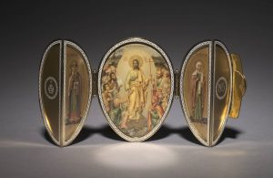 Императорское пасхальное яйцо «Триптих Красный Крест» 1915 года остается звездой галереи Фаберже. Яйцо было создано мастером Хенриком Вигстрёмом, так же, как и яйцо «Красный крест c портретами», хранящийся в Художественном музее Вирджинии, Ричмонд. Пронзительная работа, созданная в разгар Первой мировой войны, была заказана в честь старших дочерей императора, Ольги и Татьяны, преданных медицинской службе во время войны. Яйцо отражает общее настроение строгости в военное время. Оно украшено двумя простыми красными эмалевыми крестами, миниатюрами Ольги и Татьяны, на белом эмалевом фоне. При открытии яйца обнаруживается сюрприз – триптих. По центру триптиха находится икона Воскресения Христа, Святая Ольга слева и Святая мученица Татьяна справа. На ребре дверей выполнена монограмма царицы и указана дата – «1915».