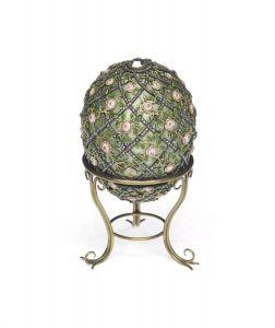 2. Яйцо «Решетка с розами» 22 апреля 1907 г. царь Николай II подарил своей жене Александре Федоровне в ознаменование рождения тремя годами ранее царевича Алексея Николаевича. Из-за русско-японской войны 1904 г. императорские пасхальные яйца не заказывались в течение двух лет. Золотое яйцо покрыто бледно-зелёной эмалью и украшено алмазной решёткой и бутонами роз, покрытых матовой, светлой и тёмной розовой эмалью, с изумрудно-зелёными листками. На верхней и нижней частях яйца приклеплены крупные бриллианты. В качестве сюрприза в яйце находились бриллиантовое ожерелье и миниатюрный портрет царевича из слоновой кости в рамке из бриллиантов (ныне утерян). Мастер Хенрик Вигстрём.