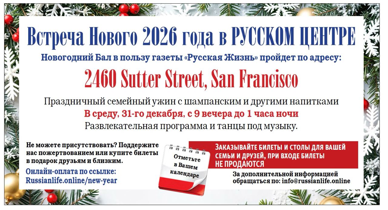 В новогоднюю ночь Русский центр Сан-Франциско распахнет свои двери для гостей благотворительного бала. Праздник пройдет в поддержку «Русской Жизни» — старейшей газеты Зарубежья, которая в наступающем году отметит свой 105-летний юбилей.