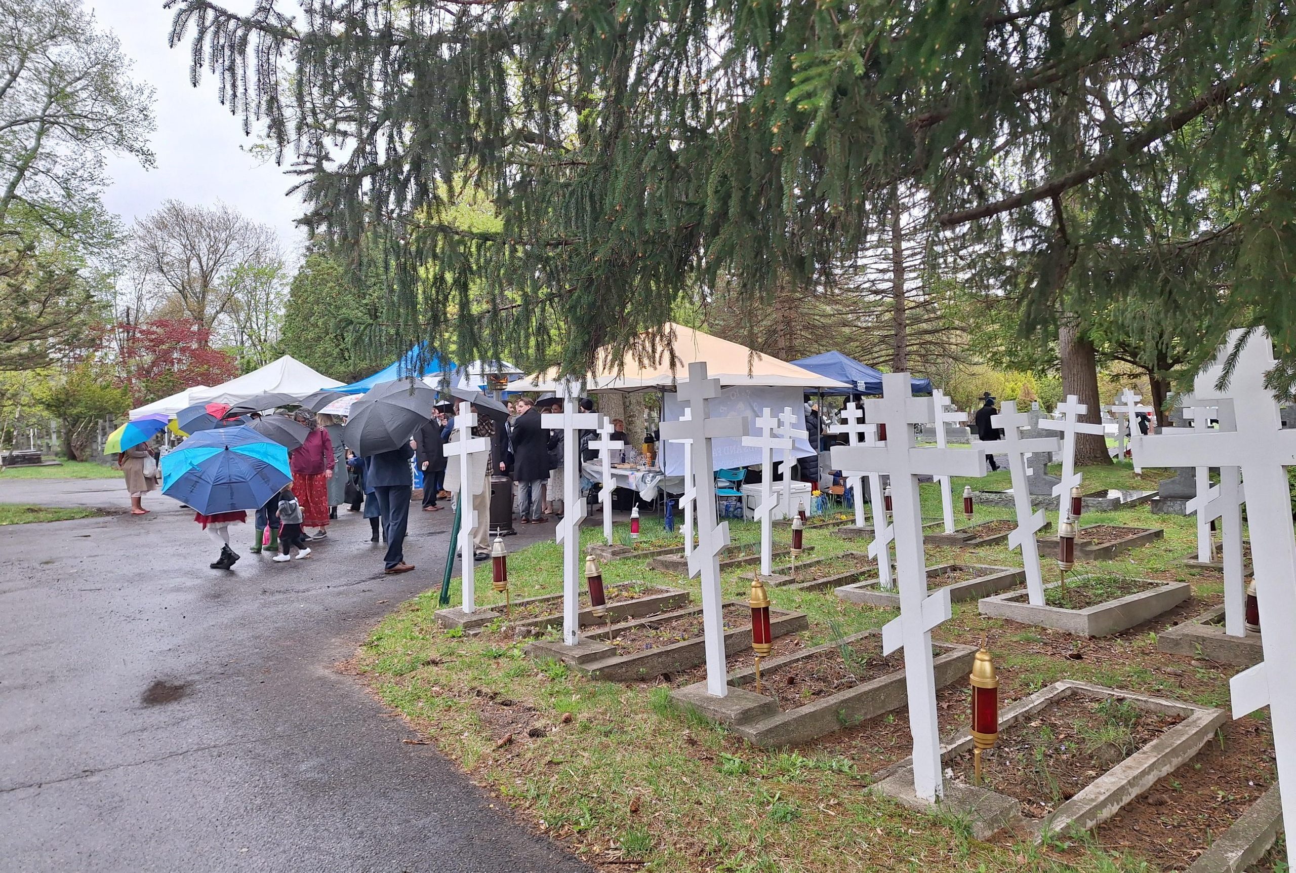 Вот почему уже десятилетиями при монастыре сложилась традиция отмечать этот день в первое воскресенье после Пасхи, на Красную Горку. Прихожане монастыря называют это Воскресенье поминальным. Сотни людей съезжаются сюда из соседних штатов. Проходит торжественное Богослужение с Крестным ходом и общей Панихидой на кладбище. Правда, сегодня из-за плохой погоды Крестный ход не проводился, а общая Панихида прошла в храме. Эту службу возглавил первоиерарх Русской Зарубежной Церкви митрополит Восточно-Американский и Нью-Йоркский Николай. А затем десятки священнослужителей, которые также специально приезжают сюда в этот день, служили по просьбе прихожан панихиды на могилах родных и близких. Из года в год можно наблюдать здесь это торжественно-печальное действо.